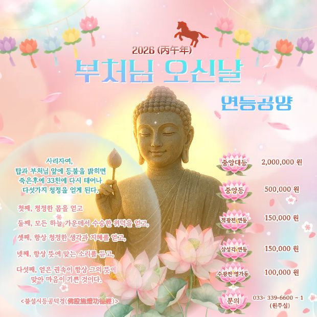 2026년(병오년) 부처님 오신날 연등 안내 페이지 정보 작성자 월정사 지킴이 작성일25-11-20 14:22 조회526회 댓글0건 본문 댓글목록 등록된 댓글이 없습니다. 이전글 다음글 목록