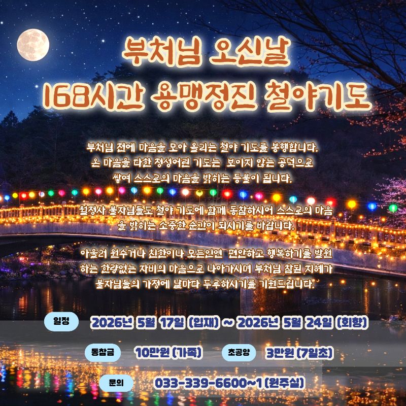 2026년 부처님 오신날 168시간 용맹정진 철야기도 페이지 정보 작성자 월정사 지킴이 작성일26-04-06 15:04 조회203회 댓글0건 본문 댓글목록 등록된 댓글이 없습니다. 다음글 목록