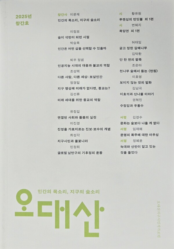 한편, 종합 교양지 <오대산>은 내년부터 연 2회 정기적으로 발행되며, 지구와 인간의 문제를 깊이 성찰하고 그 대안을 모색하는 전문가의 글을 담아낼 계획이다.