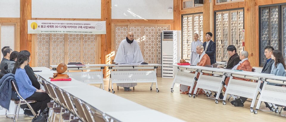 이날 협약식에는 월정사 주지 정념스님, 화엄선연구소장 향산스님, 이석환 교수, 문유정 연구원, 한국문학연구소의 김일환 소장, 전 소장 김상일 교수, 하정수 총괄팀장 등 연구진이 함께해 산사와 대학 연구기관이 손잡고 디지털 시대에 부응하는 새로운 불교문화유산 보존·활용 모델을 만들겠다는 의지를 드러냈다.