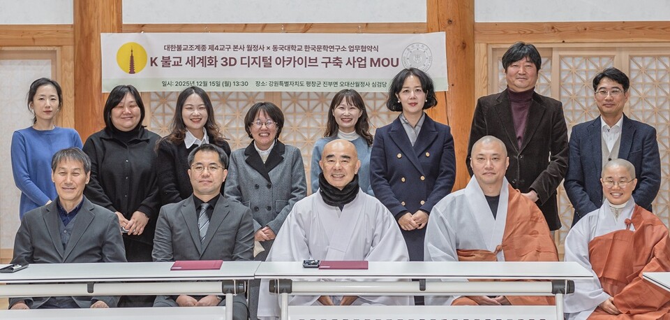 제4교구 본사 월정사(주지 정념스님)와 동국대 한국문학연구소(소장 김일환)는 12월 15일 오후 1시 30분 오대산 월정사 화엄루에서 이같은 내용을 담은 업무협약을 체결했다. 주요 내용은 △상원사중창권선문, 월인석보, 각종 언해불서 등 불교한글문화유산에 대한 자료 조사 및 정밀 실물 촬영 △오대산 월정사 및 상원사·수타사 등 말사가 소장한 불교한글문화유산 관련 지식정보 수집 및 시맨틱(의미 기반) 콘텐츠 집적 △3D 디지털 아카이브 구축을 위한 기술·인력·자료 공유 등이다.