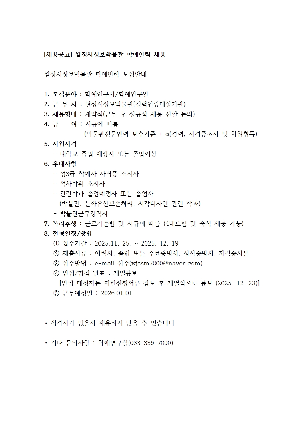 [채용공고] 월정사성보박물관 학예인력 채용공고 페이지 정보 작성자 월정사박물관 작성일25-11-28 13:18 조회152회 댓글0건 본문 댓글목록 등록된 댓글이 없습니다. 다음글 목록