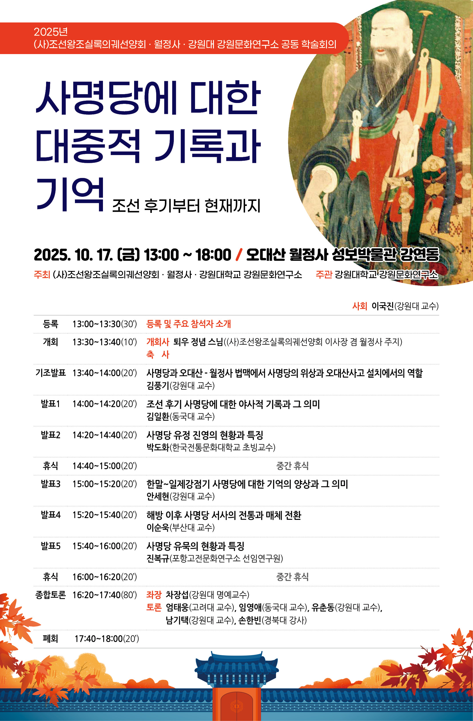 사명당에 대한 대중적 기록과 기억 (조선 후기부터 현재까지 ) 페이지 정보 작성자 월정사 지킴이 작성일25-09-30 09:07 조회244회 댓글0건 본문 댓글목록 등록된 댓글이 없습니다. 이전글 다음글 목록