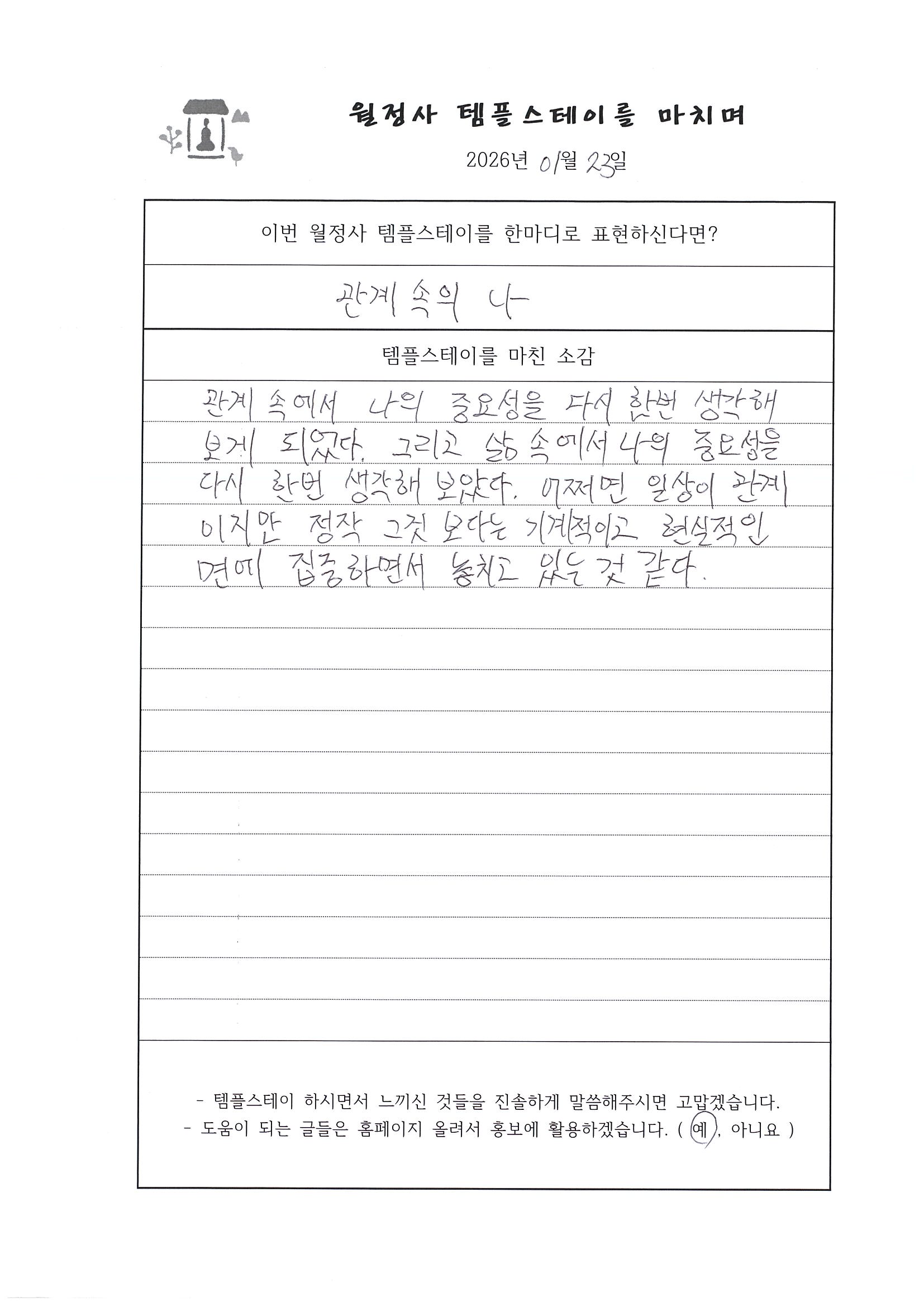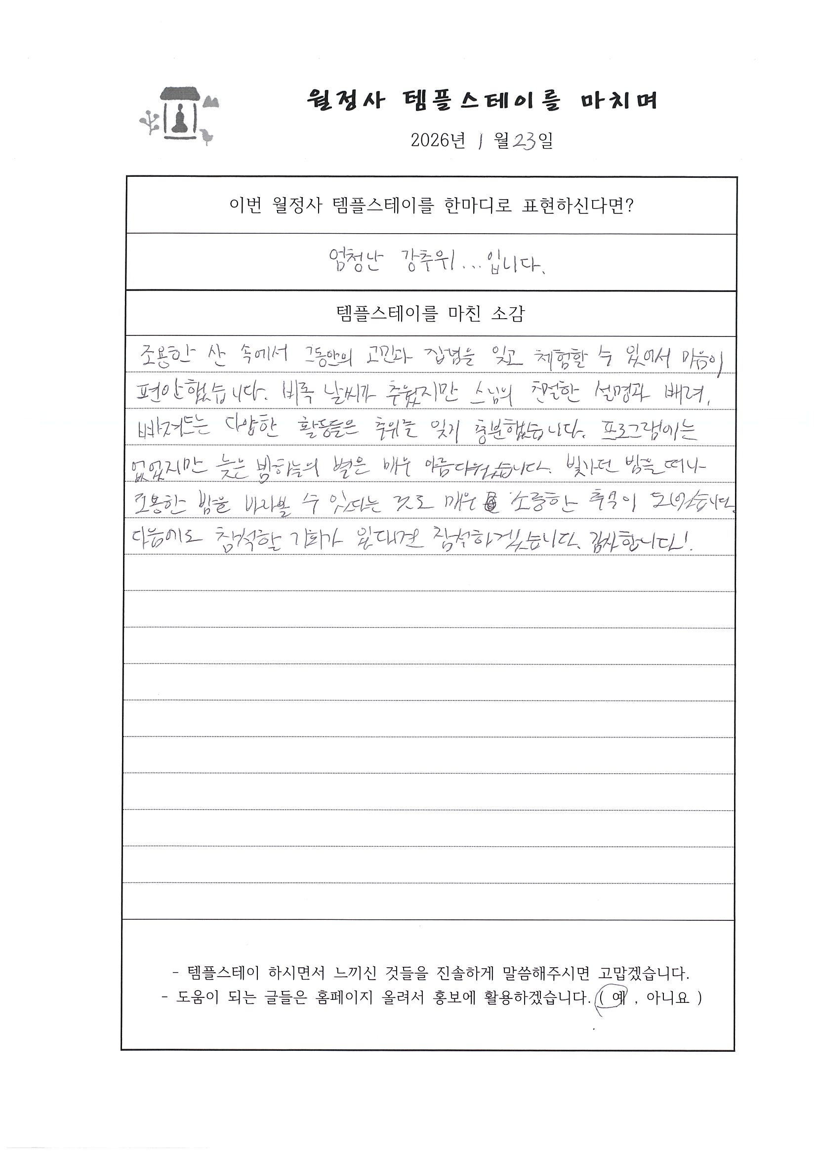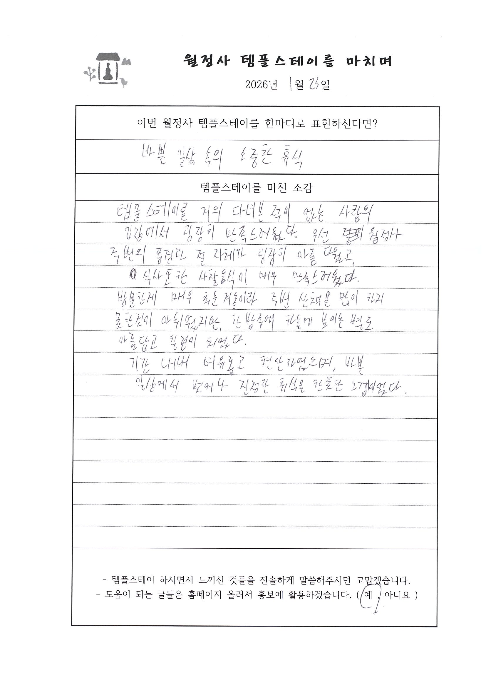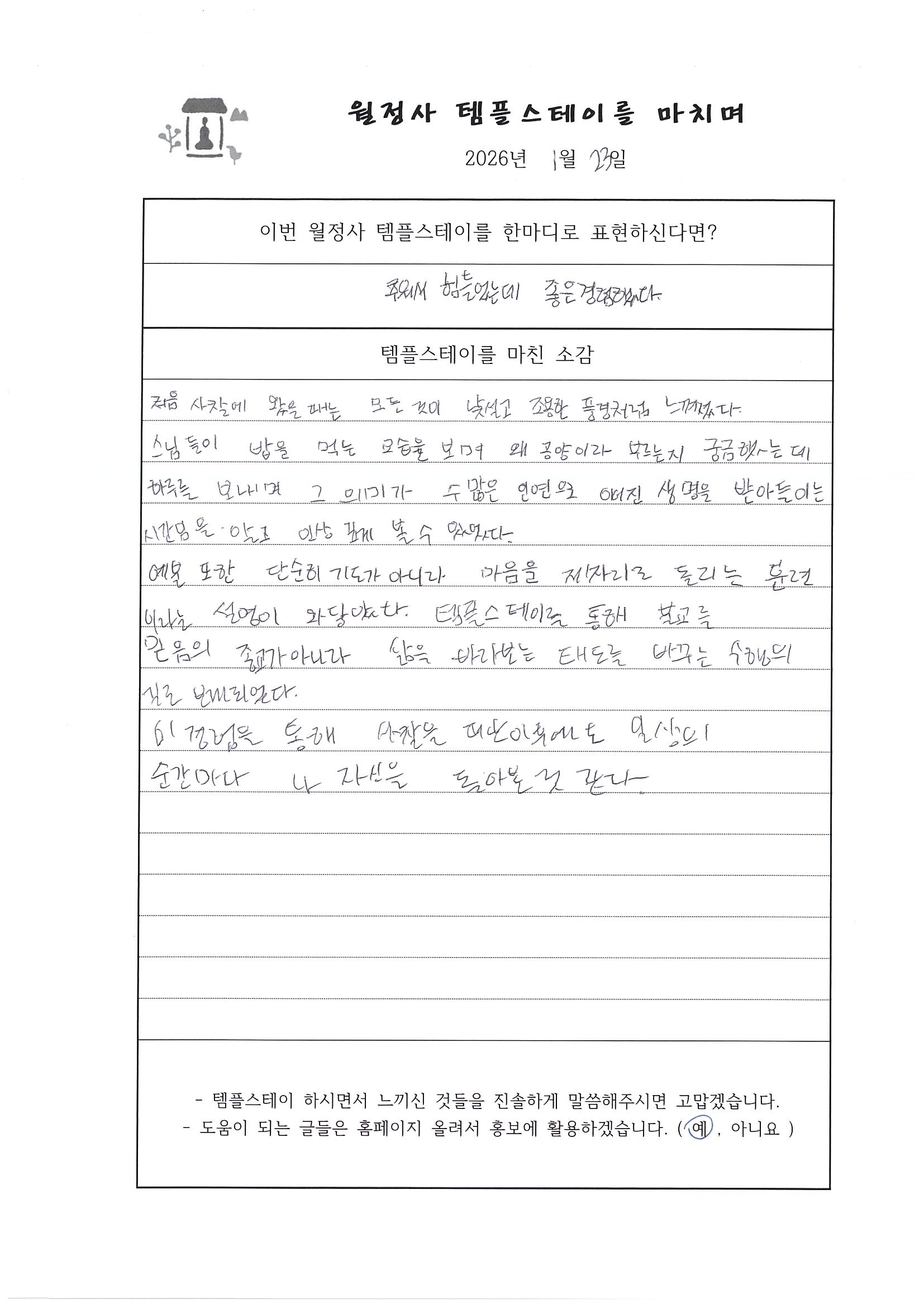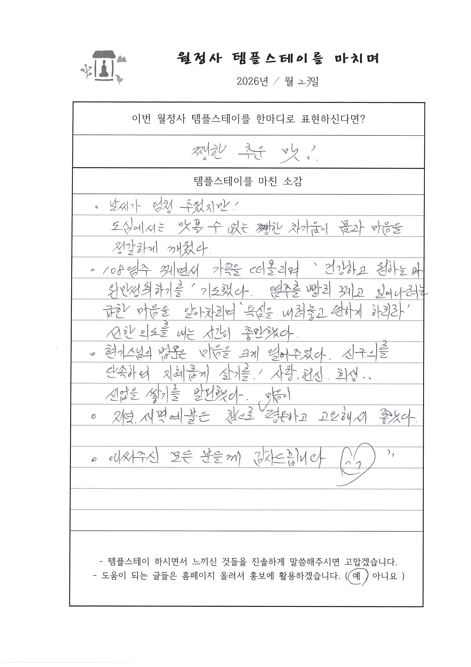 20260122~23 선명상 템플스테이 "오롯이 바라보기" 체험형 프로그램 (강원대 불교 문화 동아리) 페이지 정보 작성자 템플 작성일26-01-23 14:04 조회3회 댓글0건 본문 #월정사#선명상#큰스님과차담#108배및염주#예불#타종#아침선재길#걷기명상 댓글목록 등록된 댓글이 없습니다. 다음글 목록