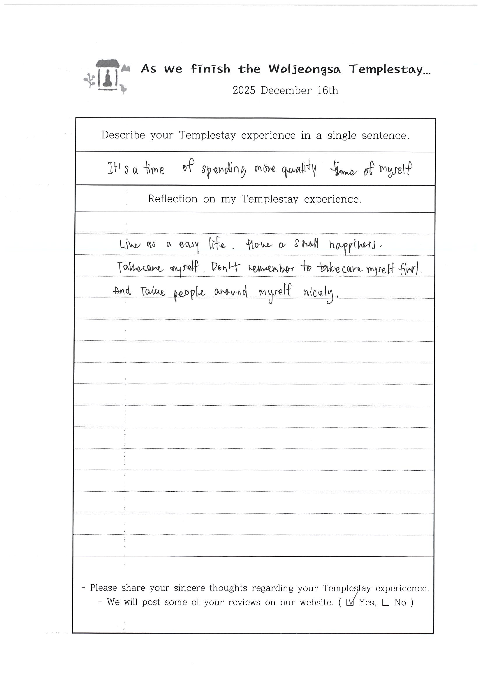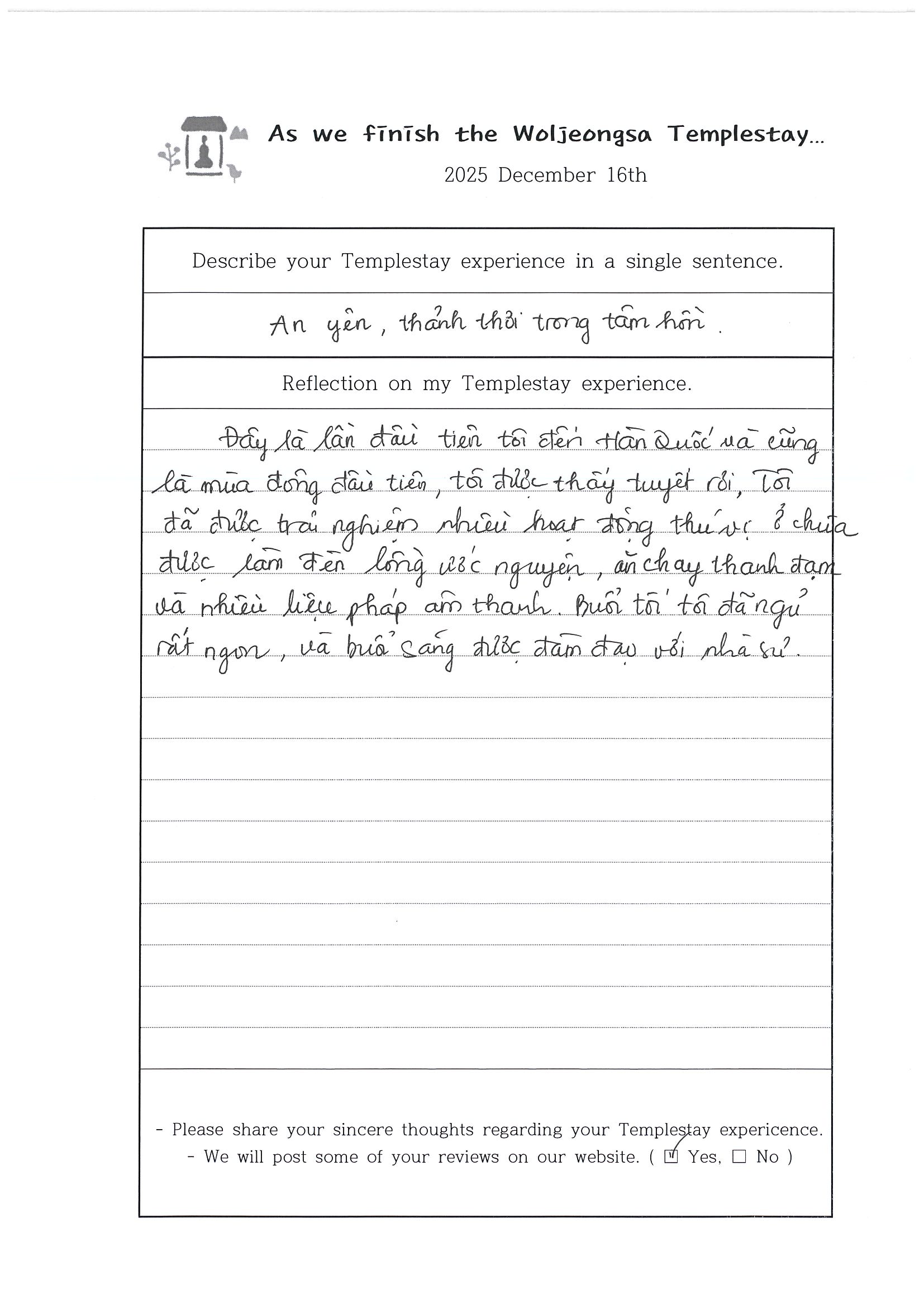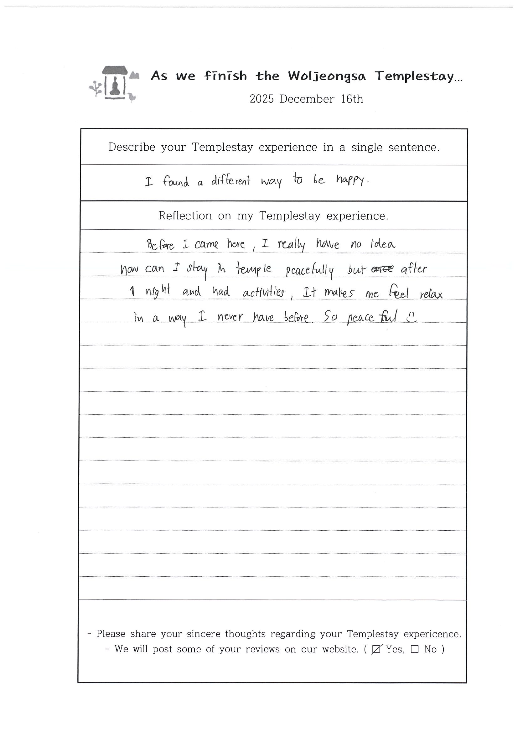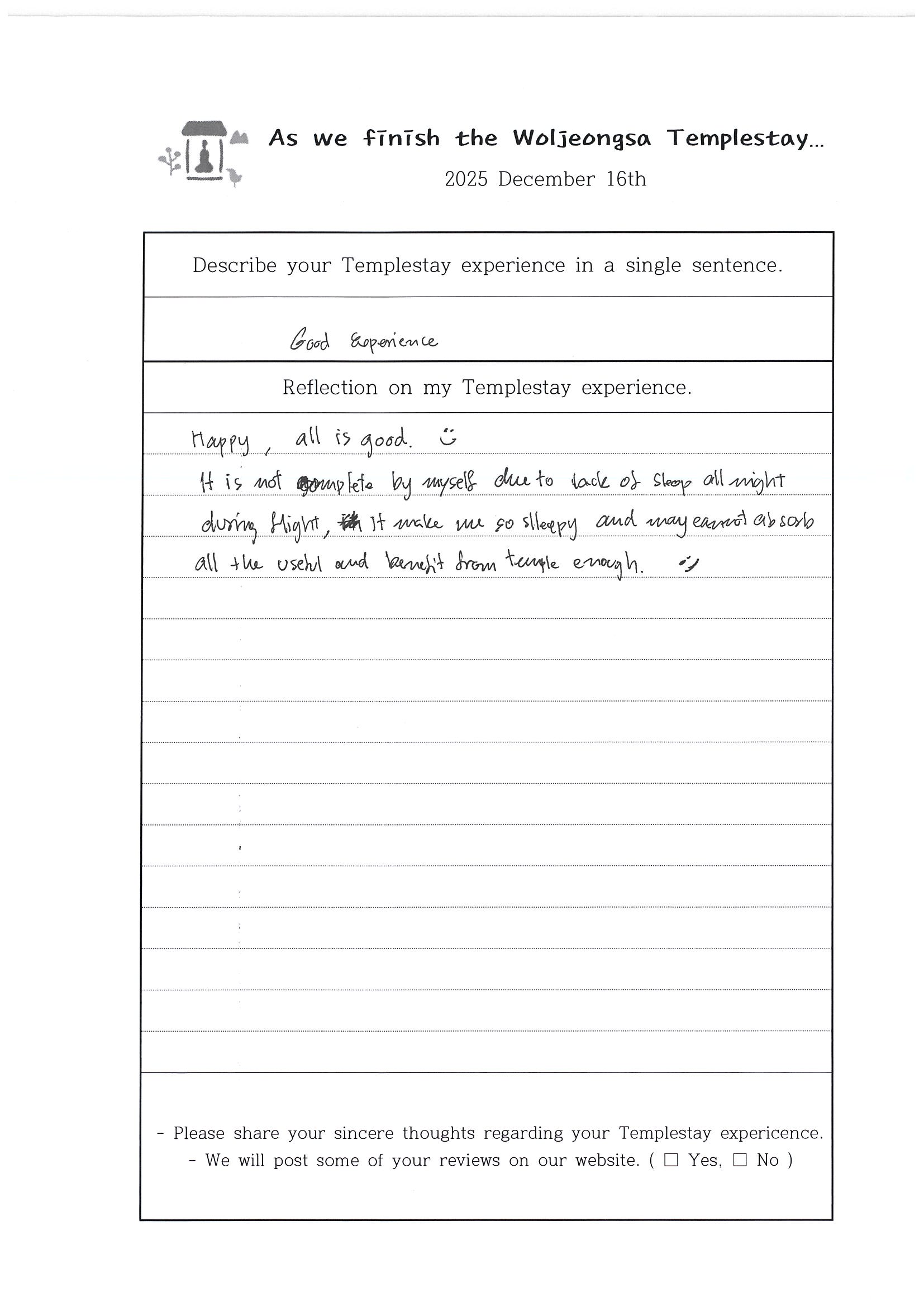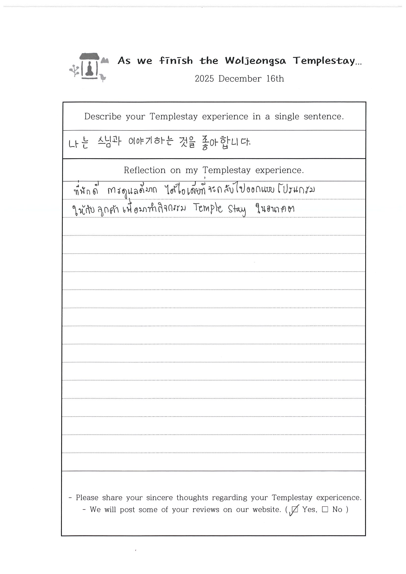 20251215~16 강원도청 초청 태국 및 베트남 여행사 종사자 "선명상" 체험형 템플스테이 페이지 정보 작성자 템플 작성일25-12-21 15:45 조회18회 댓글0건 본문 #템플스테이#월정사#선명상#소원등#타종#예불#싱잉볼체험 댓글목록 등록된 댓글이 없습니다. 다음글 목록