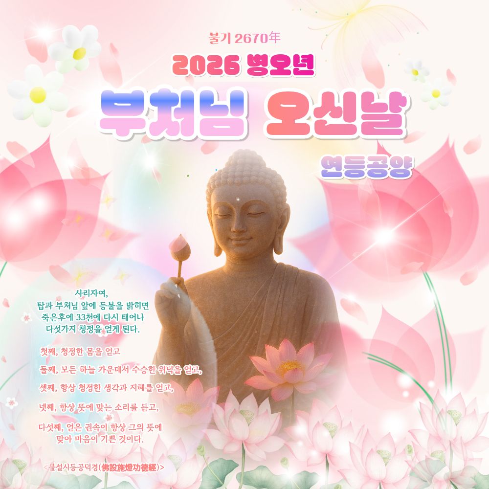 2026년(병오년) 부처님 오신날 연등 안내 페이지 정보 작성자 월정사 지킴이 작성일25-11-20 14:22 조회1,993회 댓글0건 본문 댓글목록 등록된 댓글이 없습니다. 이전글 다음글 목록