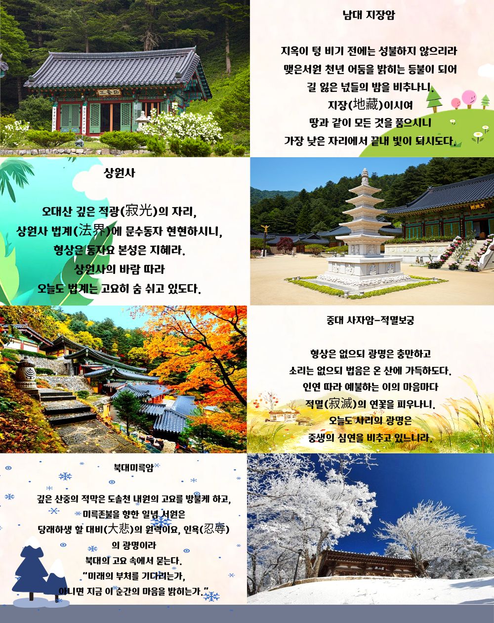 문수보살의 성산(聖山) 오대산의 암자들 페이지 정보 작성자 월정사 지킴이 작성일26-02-19 15:00 조회56회 댓글0건 본문 오대산의 고요 속으로 걸음을 옮기세요. 산과 바람, 숲의 숨결 속에서 문수보살의 지혜가 당신을 기다립니다. 댓글목록 등록된 댓글이 없습니다. 다음글 목록