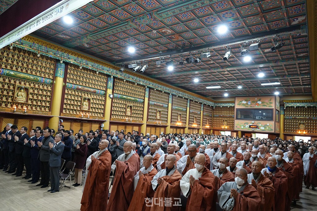 법회는 새해 통알의식(부처님전 삼배, 승가전 삼배)을 시작으로 내빈 축사, 교구본사 주지 법어, 신행단체장 표창장 및 장학금 수여 순으로 진행됐다.