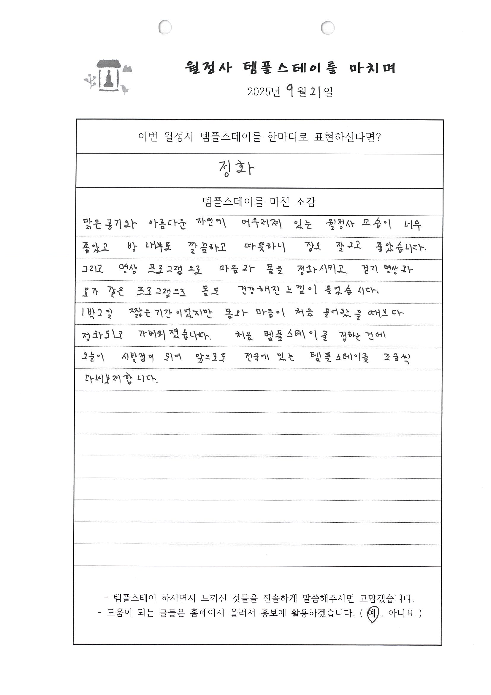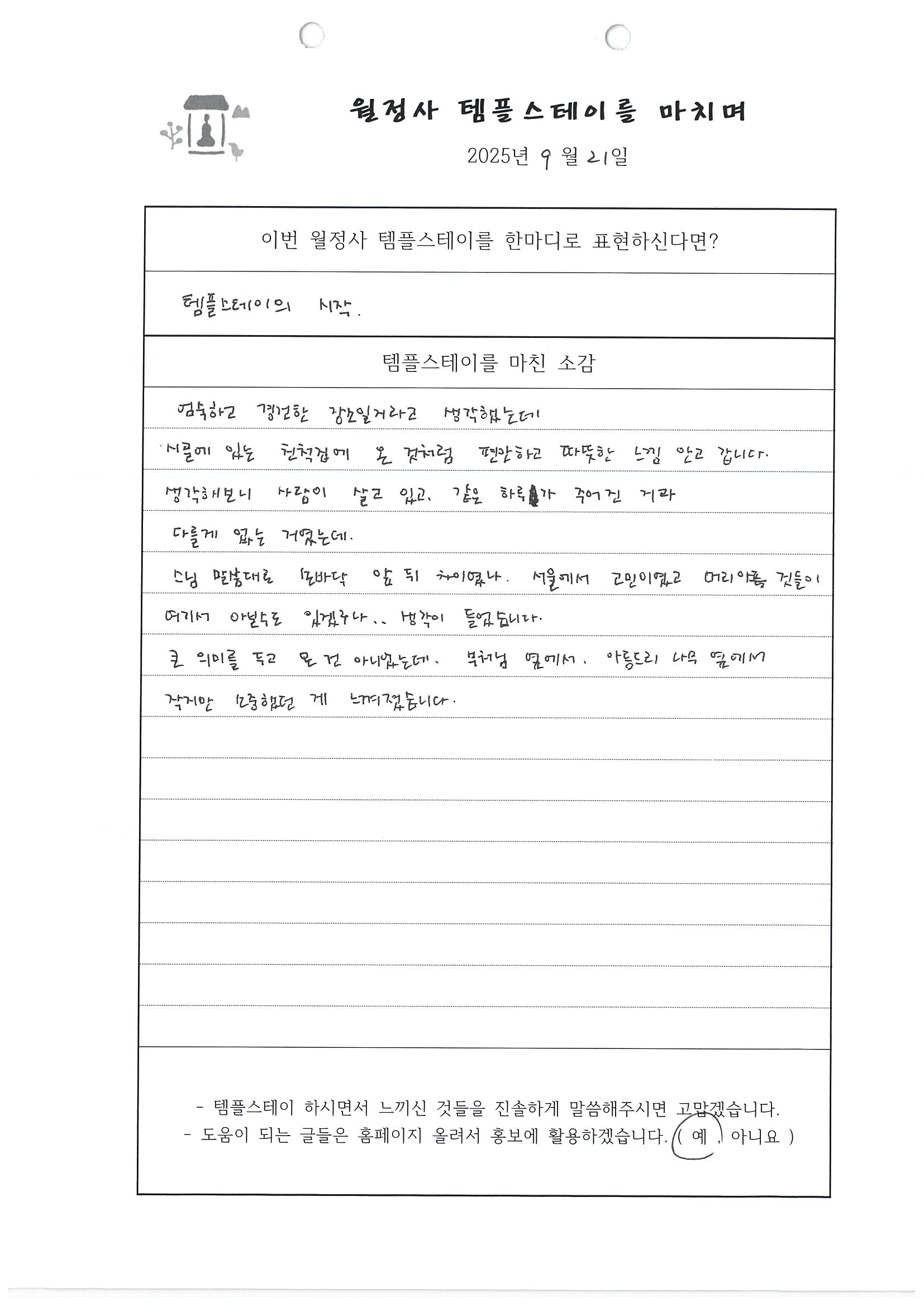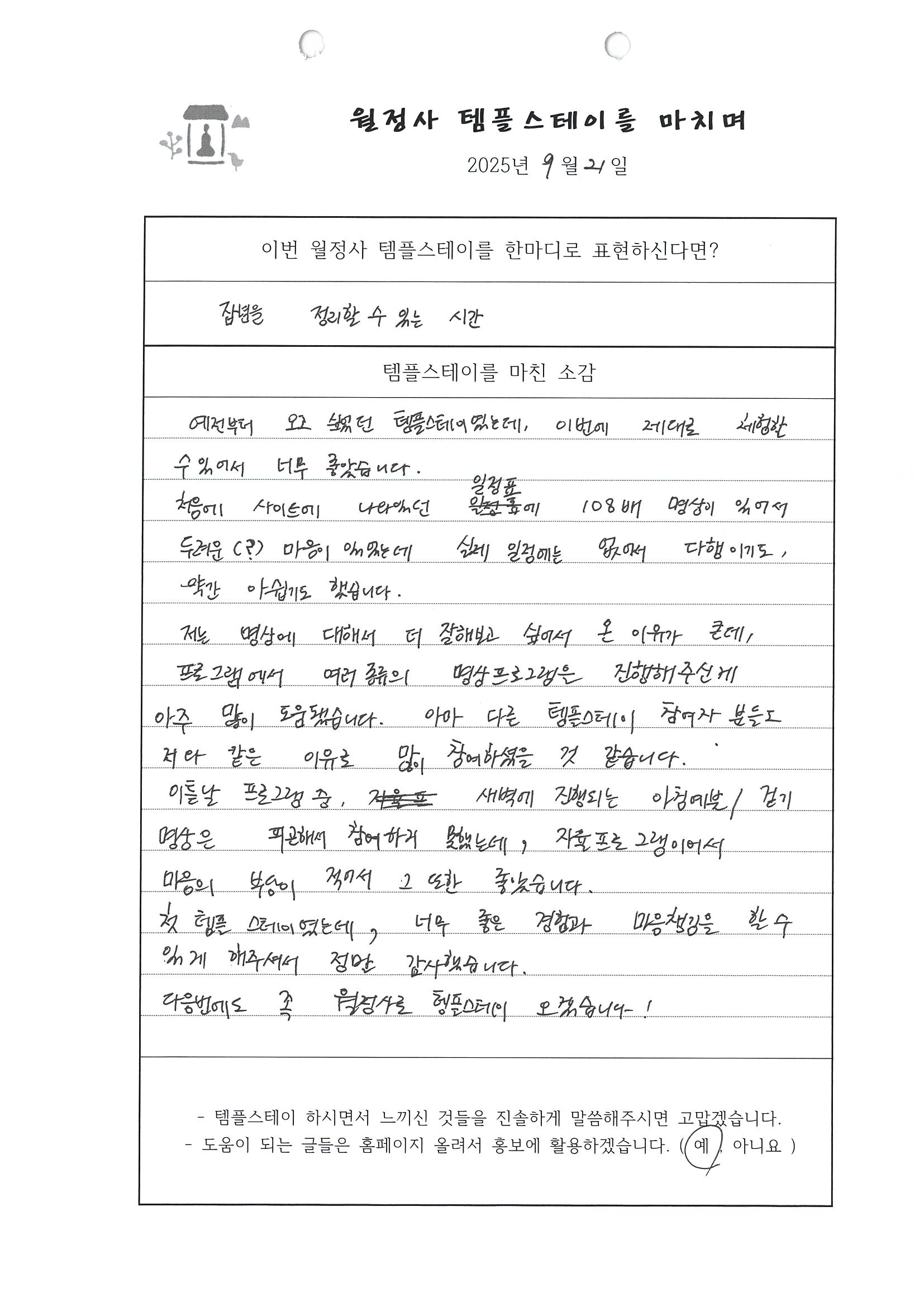 20250920~21 선명상"고요한 산사에서 만나는 나의 참모습" 페이지 정보 작성자 템플 작성일25-09-23 16:42 조회111회 댓글0건 본문 #월정사#선명상#스님과차담#스틱요가#LED등야간명상#전나무숲길#예불#싱잉볼 댓글목록 등록된 댓글이 없습니다. 이전글 다음글 목록