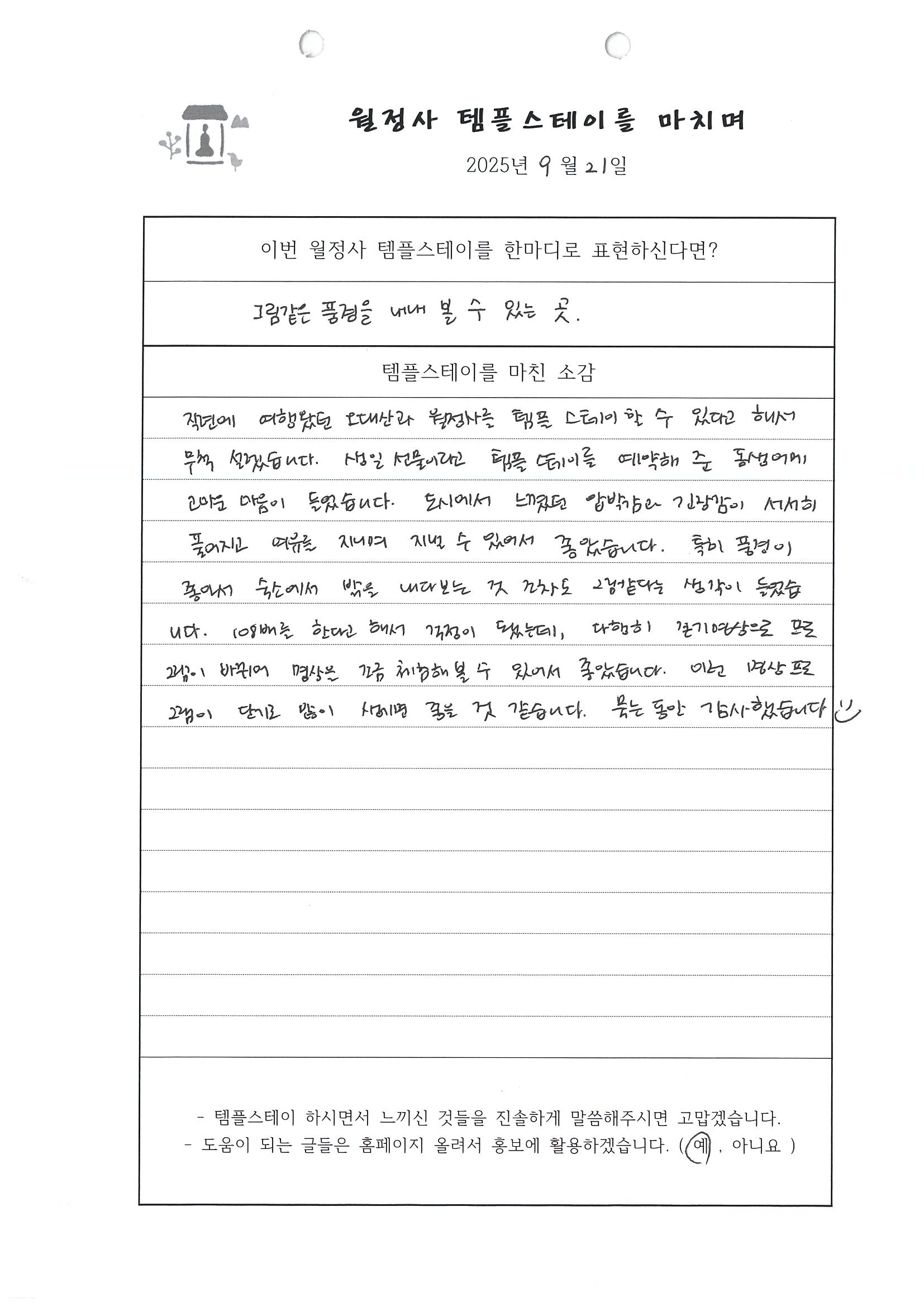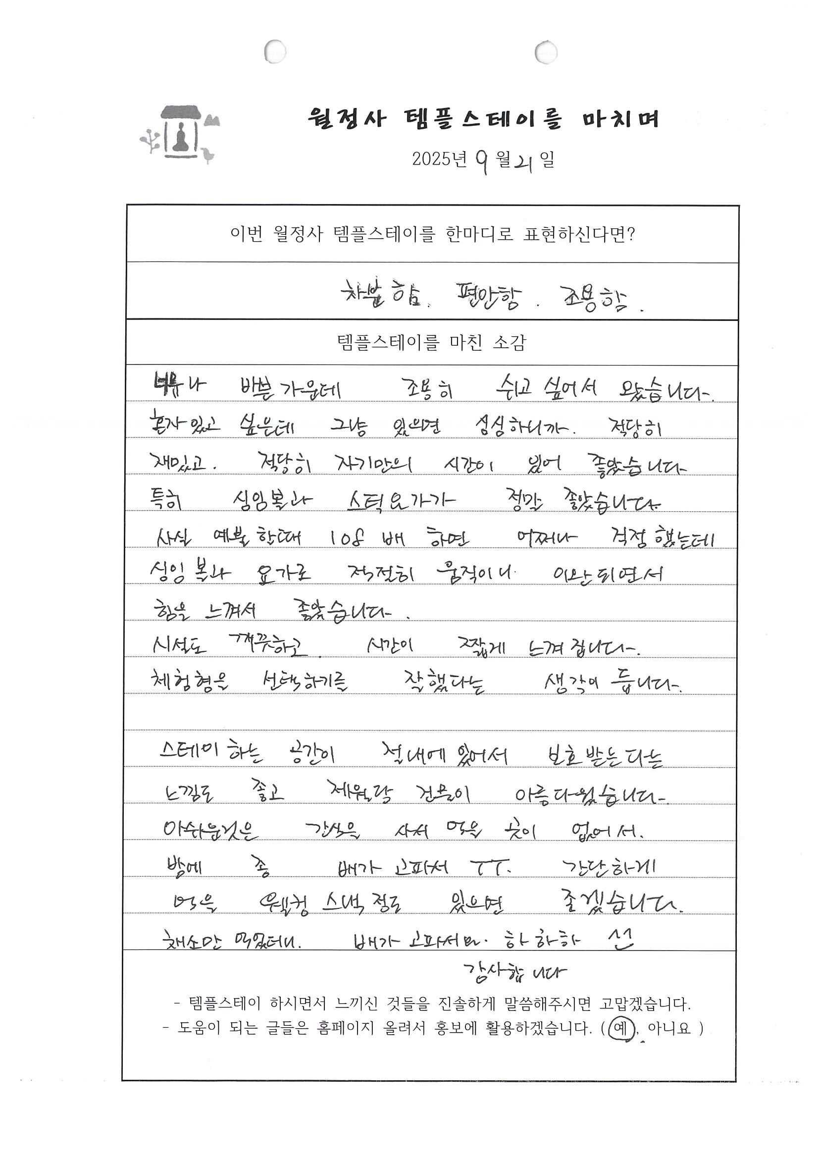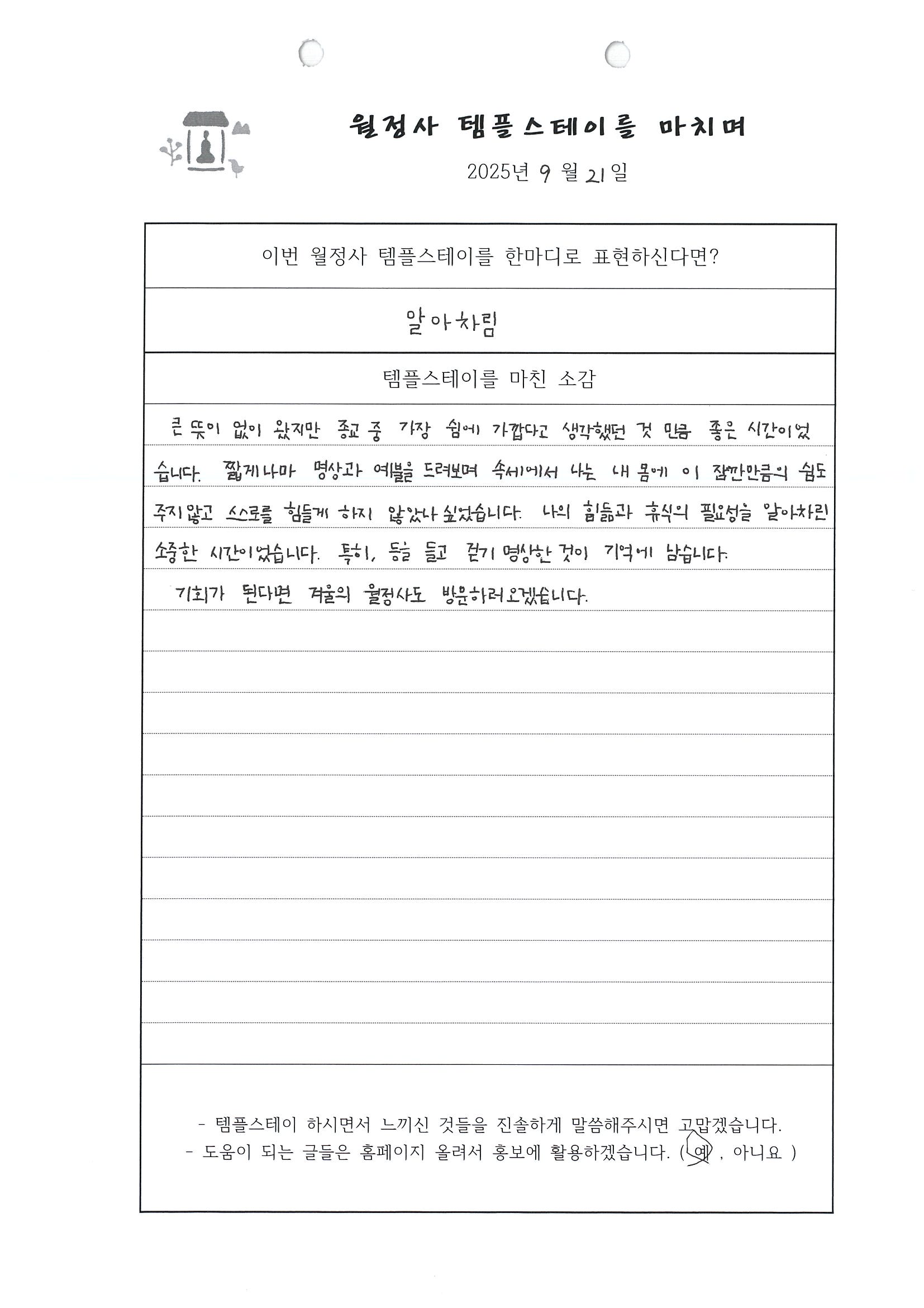 20250920~21 선명상"고요한 산사에서 만나는 나의 참모습" 페이지 정보 작성자 템플 작성일25-09-23 16:42 조회111회 댓글0건 본문 #월정사#선명상#스님과차담#스틱요가#LED등야간명상#전나무숲길#예불#싱잉볼 댓글목록 등록된 댓글이 없습니다. 이전글 다음글 목록