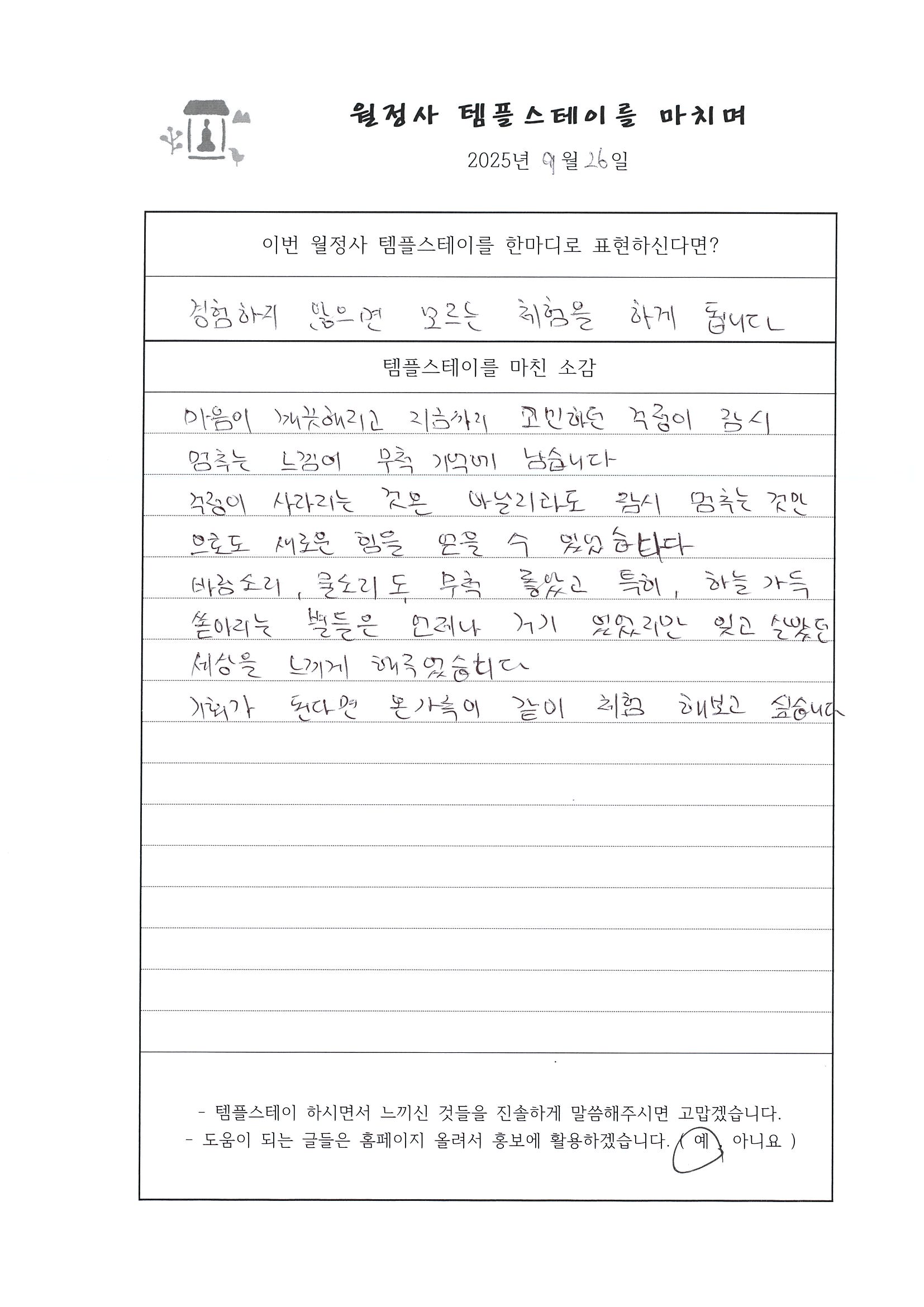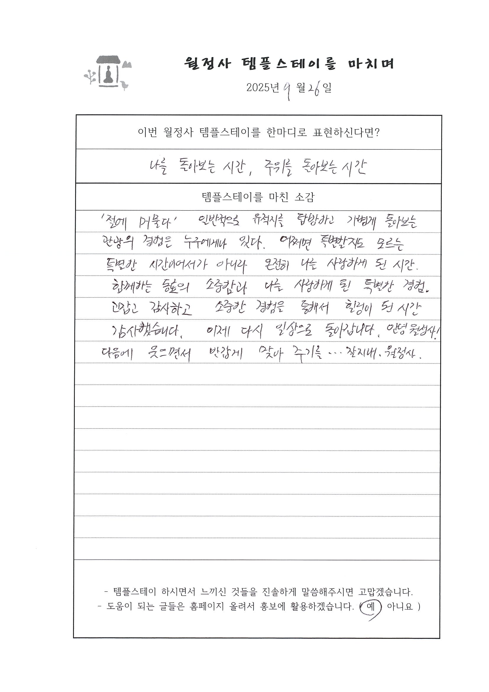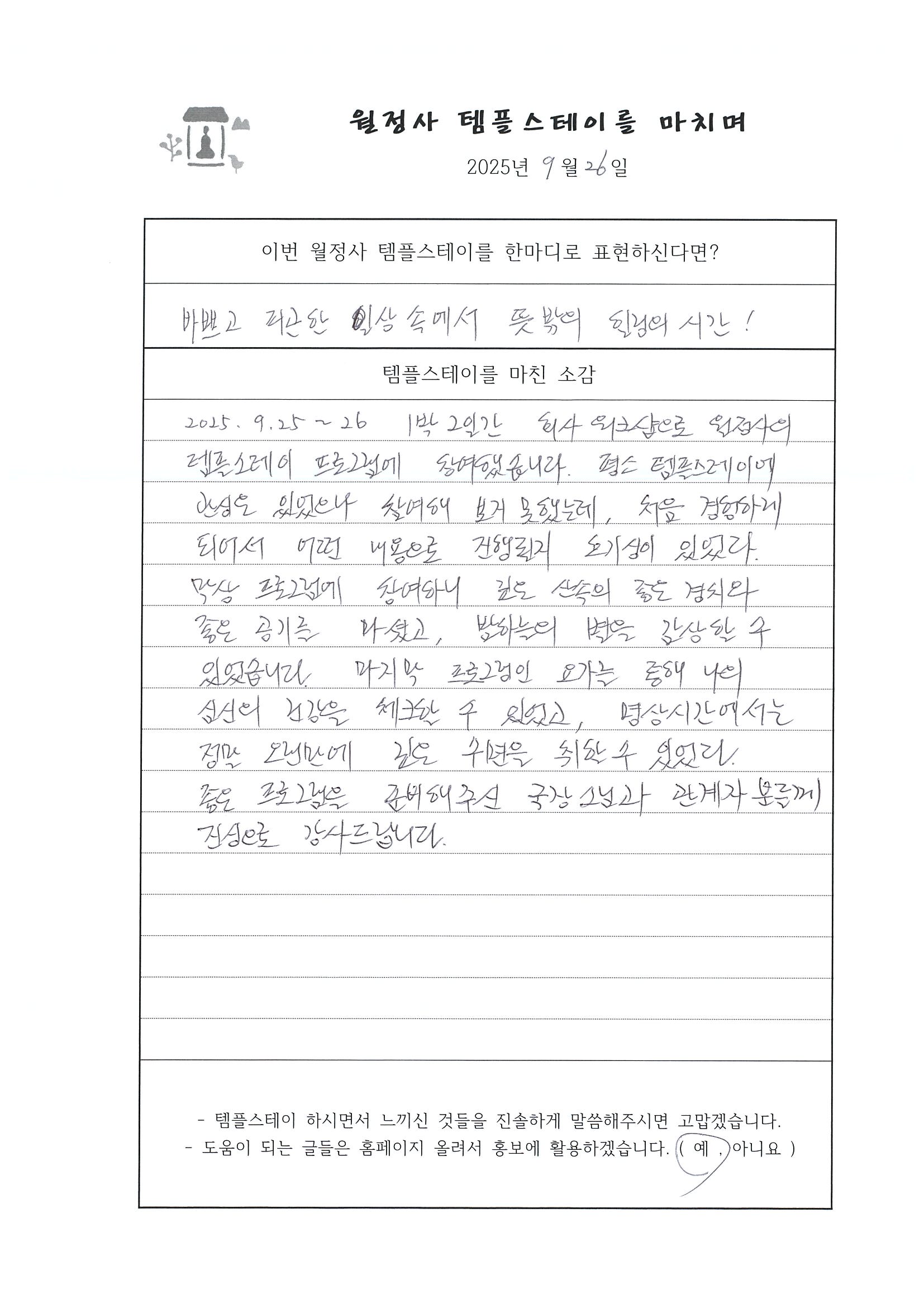 20250925~26 한국산업기술진흥협회 "선명상 템플스테이" 페이지 정보 작성자 템플 작성일25-09-26 15:31 조회95회 댓글0건 본문 #월정사#선명상#큰스님과차담#타종##소원등#LED등#전나무숲길#스틱요가 댓글목록 등록된 댓글이 없습니다. 이전글 다음글 목록