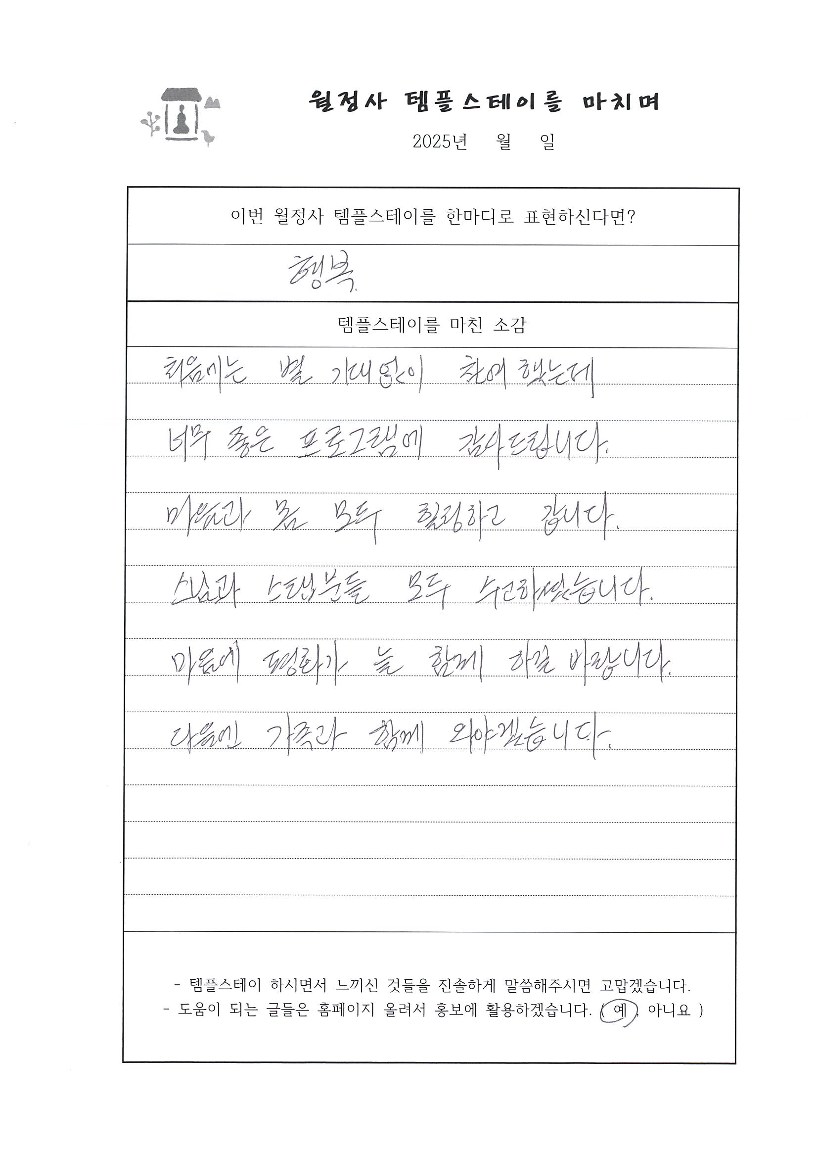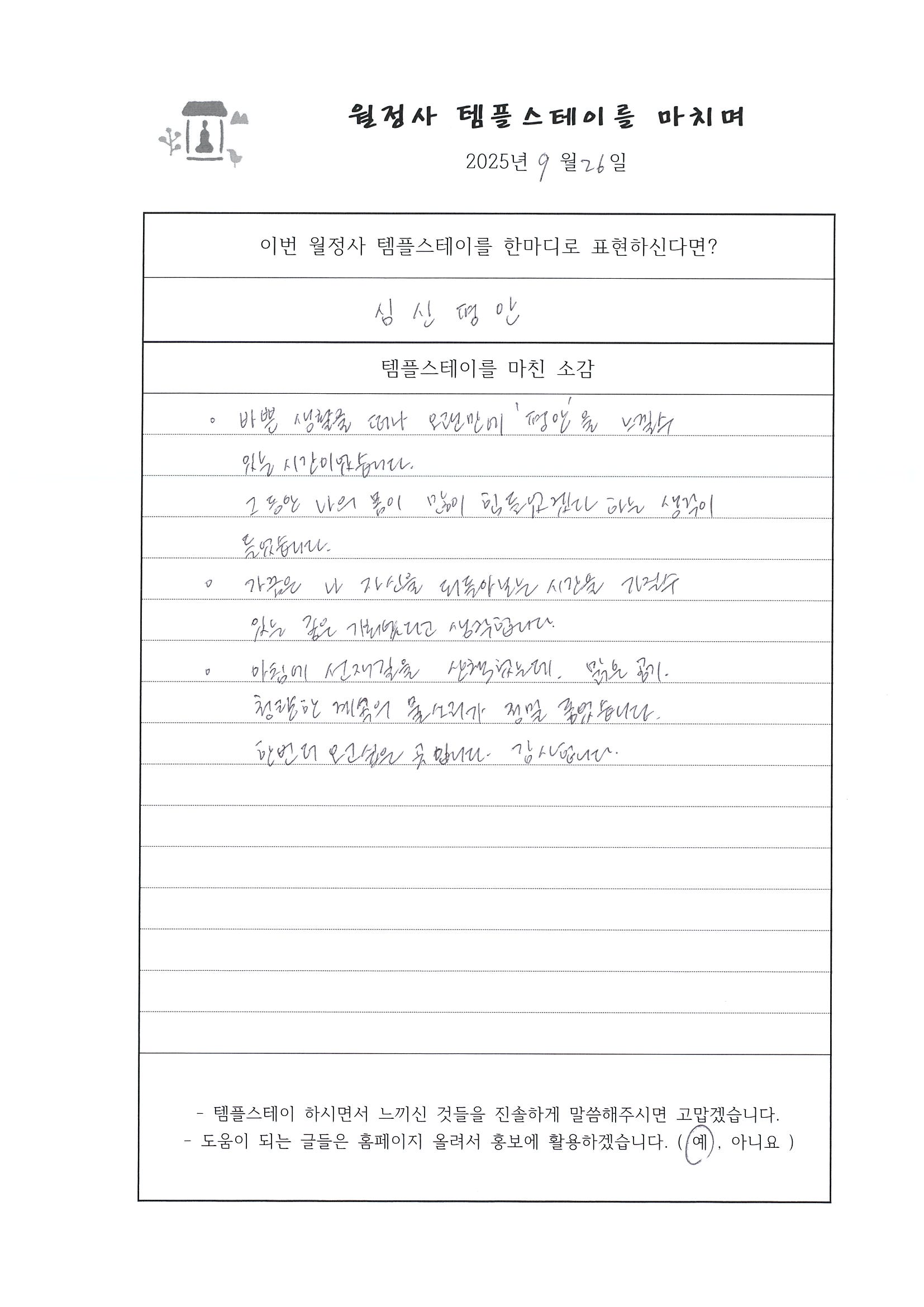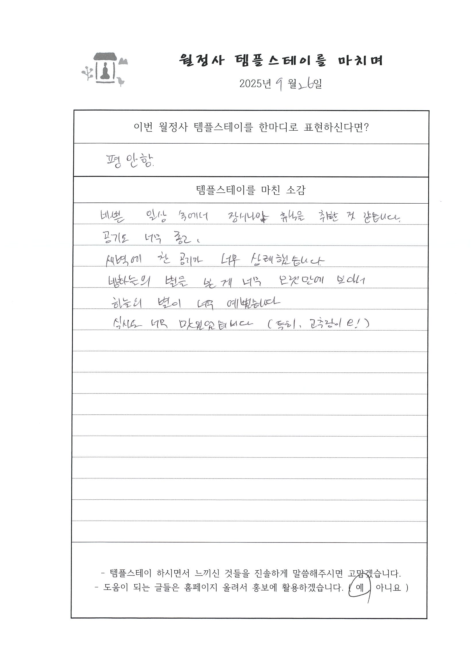 20250925~26 한국산업기술진흥협회 "선명상 템플스테이" 페이지 정보 작성자 템플 작성일25-09-26 15:31 조회95회 댓글0건 본문 #월정사#선명상#큰스님과차담#타종##소원등#LED등#전나무숲길#스틱요가 댓글목록 등록된 댓글이 없습니다. 이전글 다음글 목록