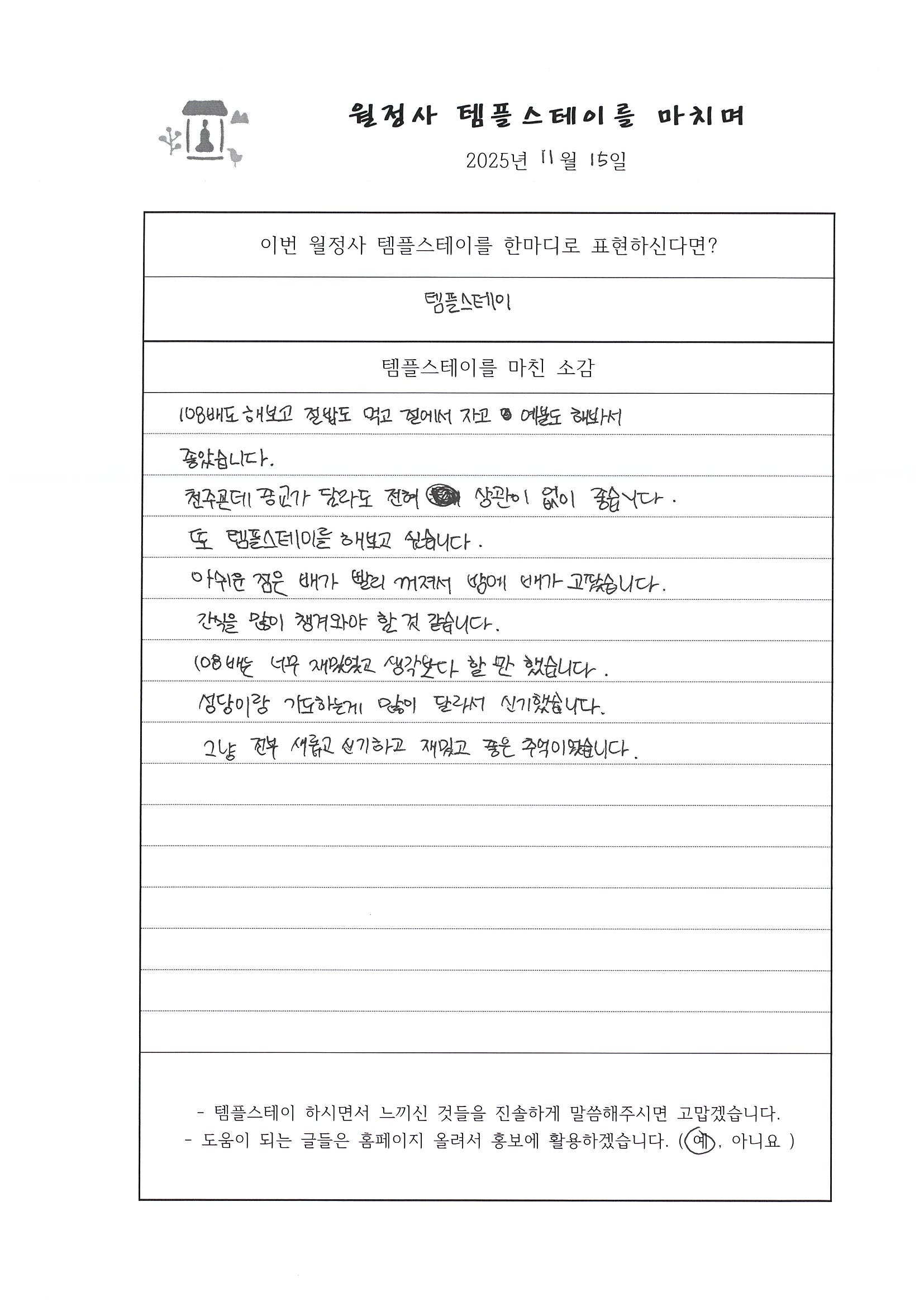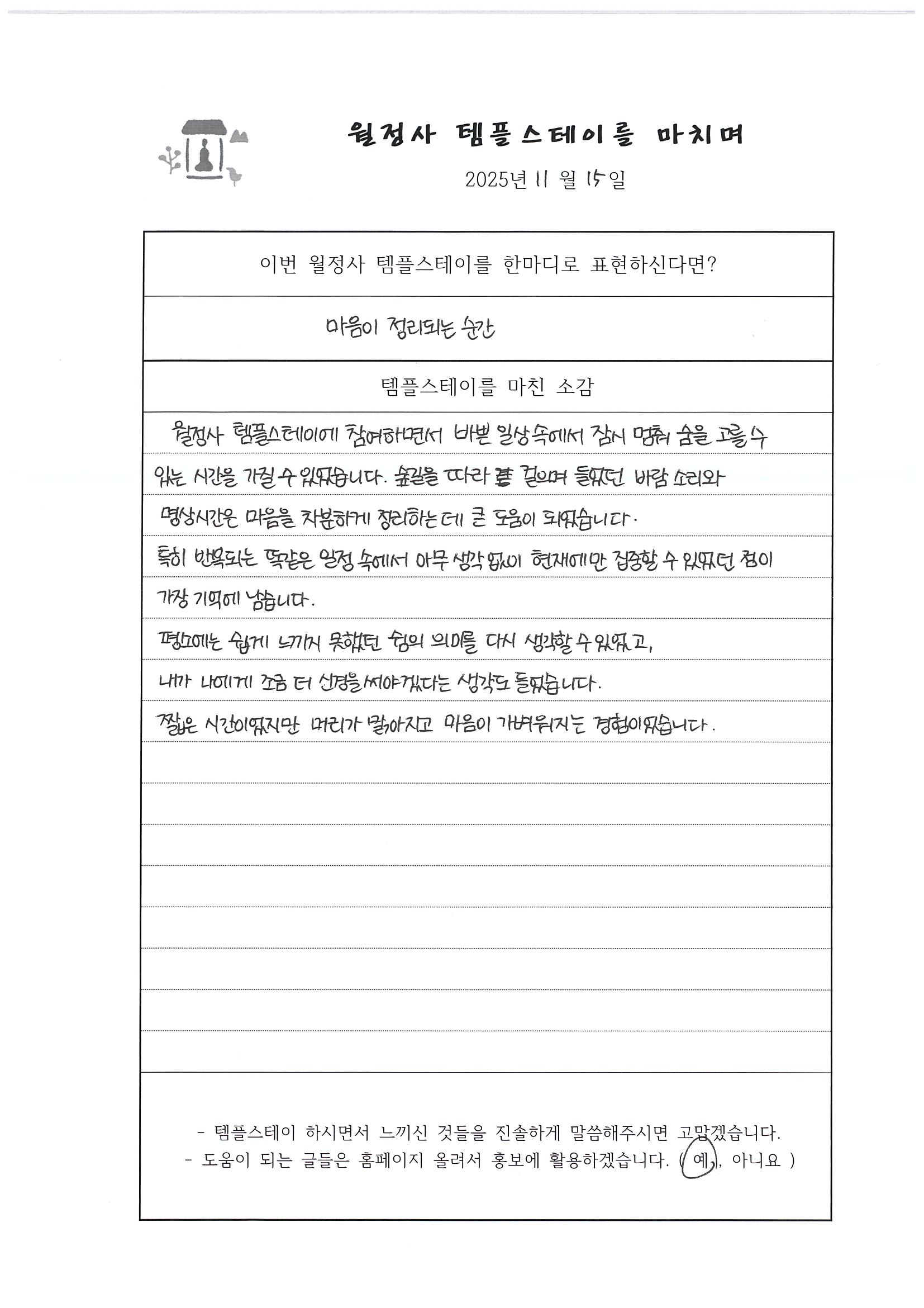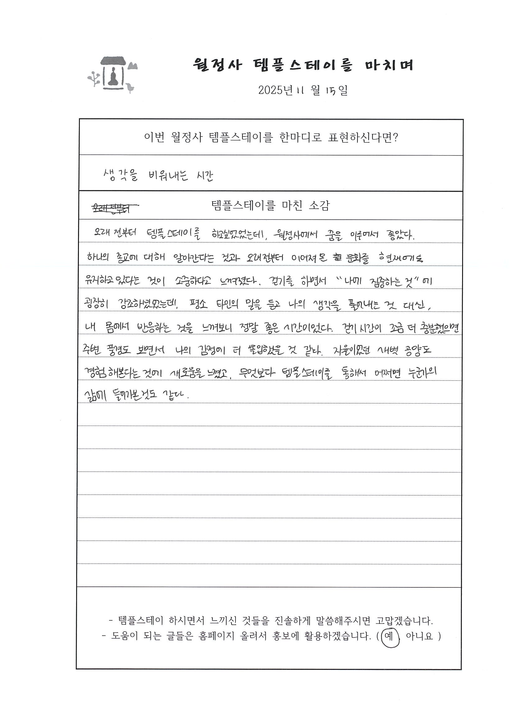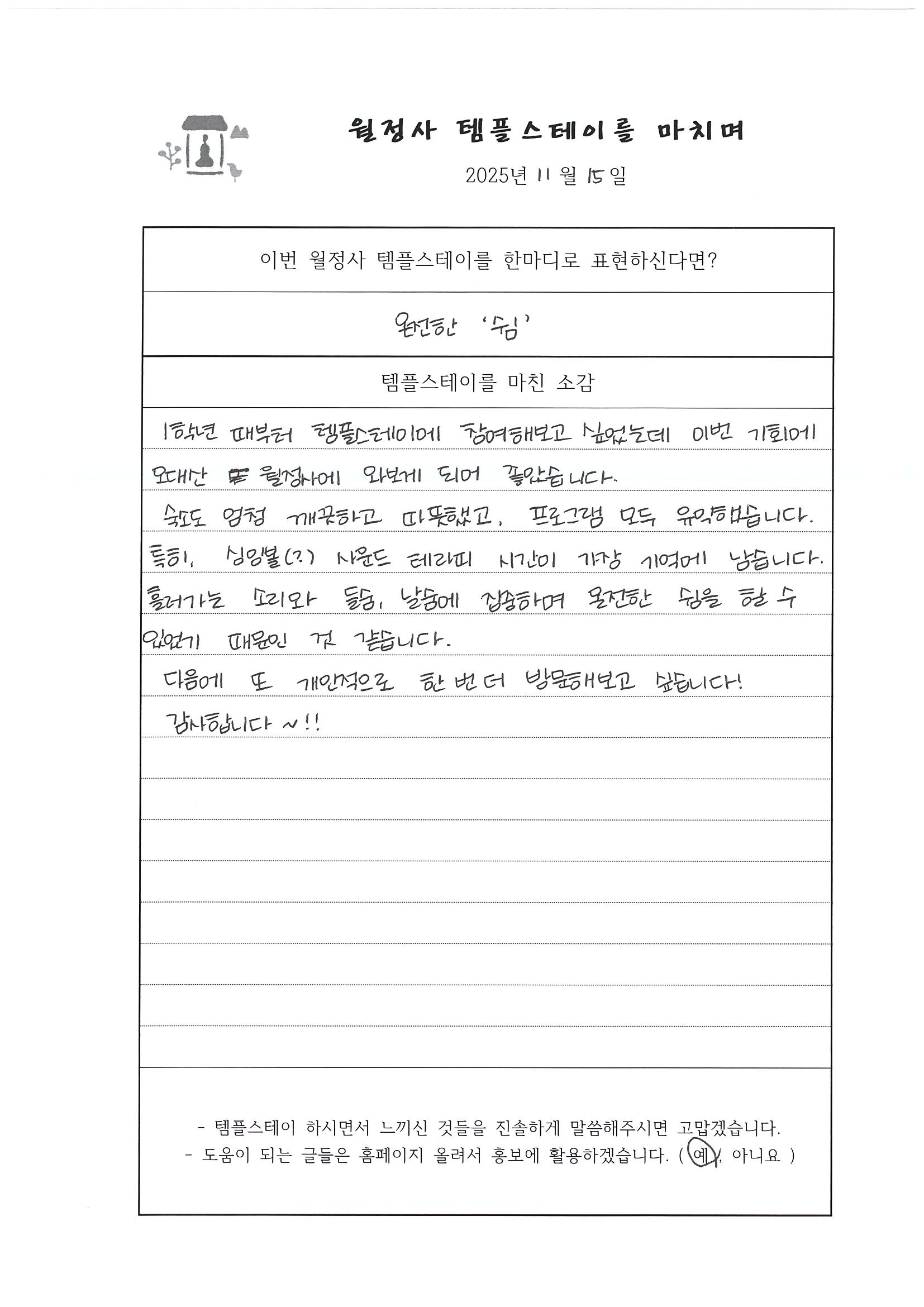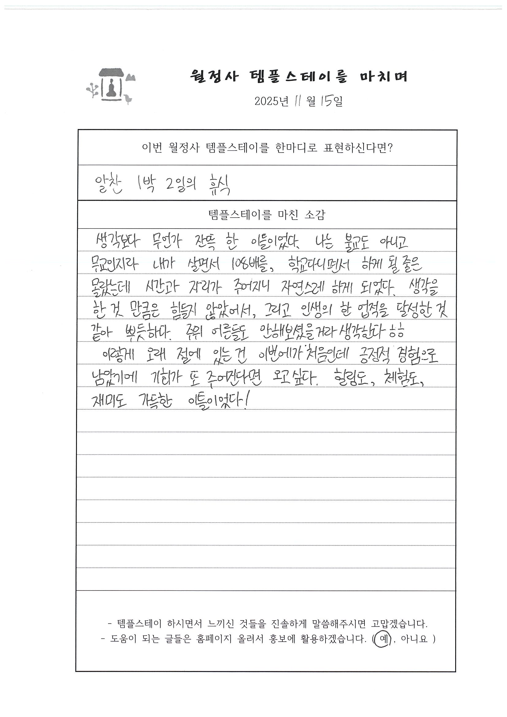 20251114~15 국립강릉원주대학교(원주캠퍼스)"선명상" 템플스테이 체험형 페이지 정보 작성자 템플 작성일25-11-15 15:21 조회178회 댓글0건 본문 #월정사#108배 및 염주만들기#예불#싱잉볼#타종#걷기명상#스님과의차담 댓글목록 등록된 댓글이 없습니다. 이전글 다음글 목록
