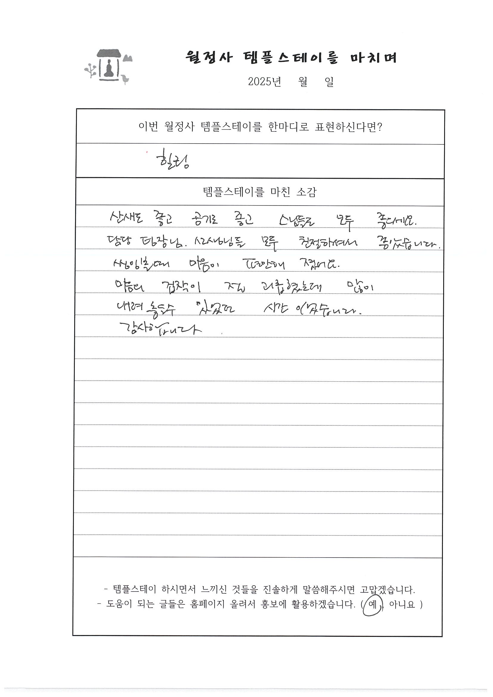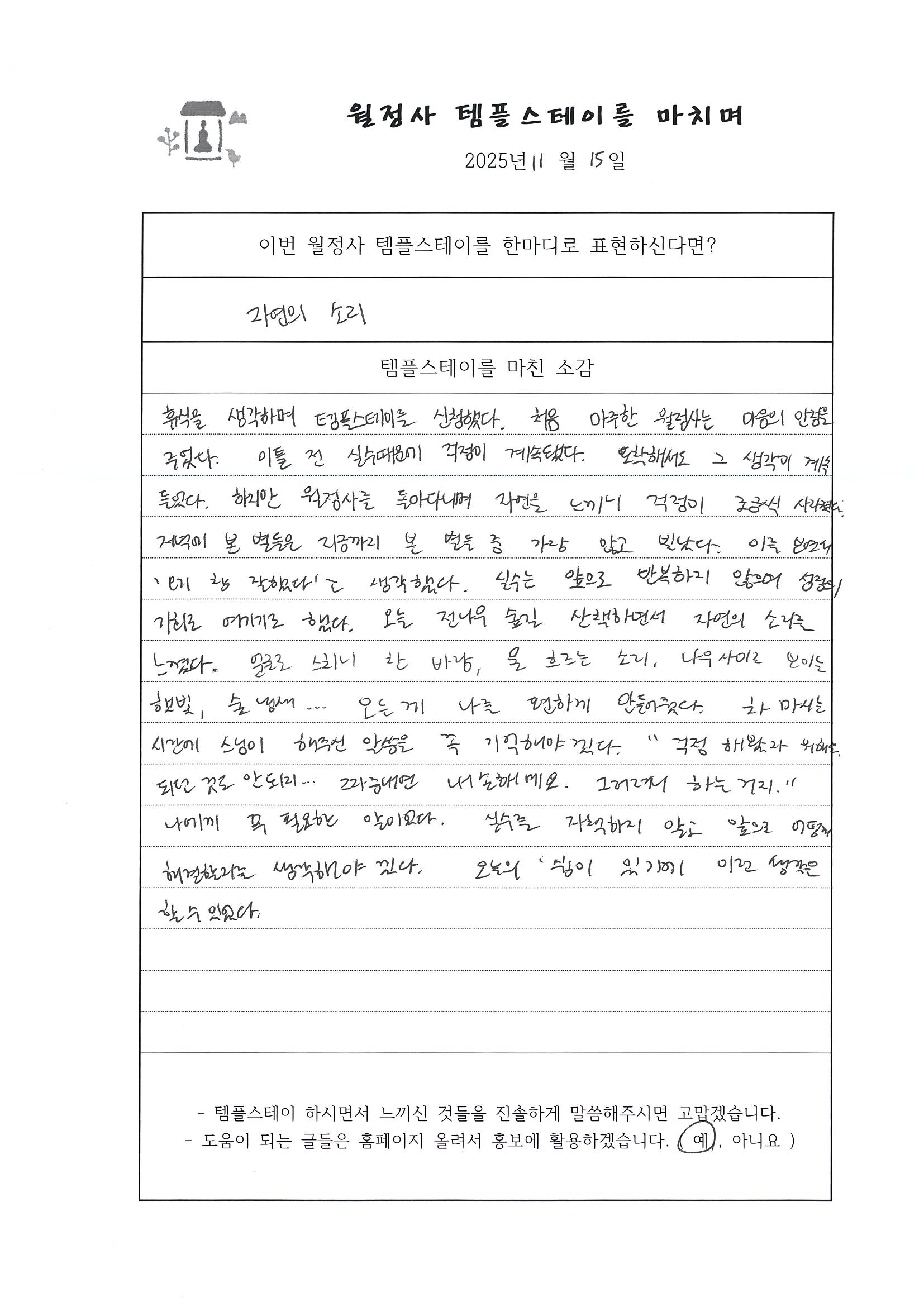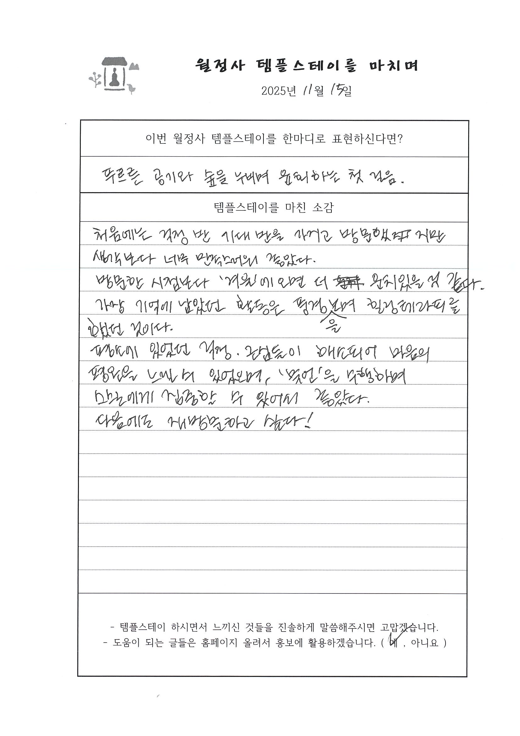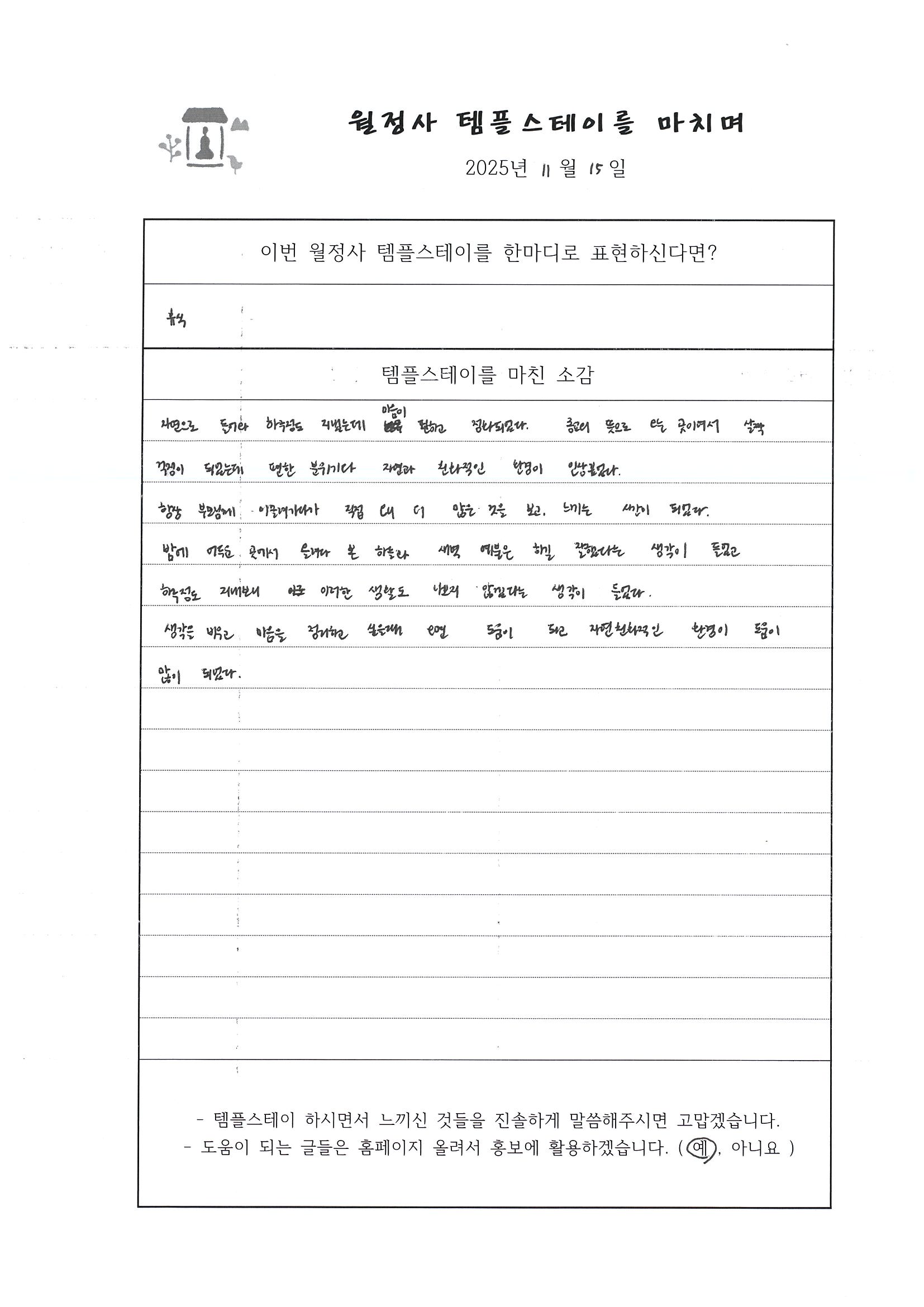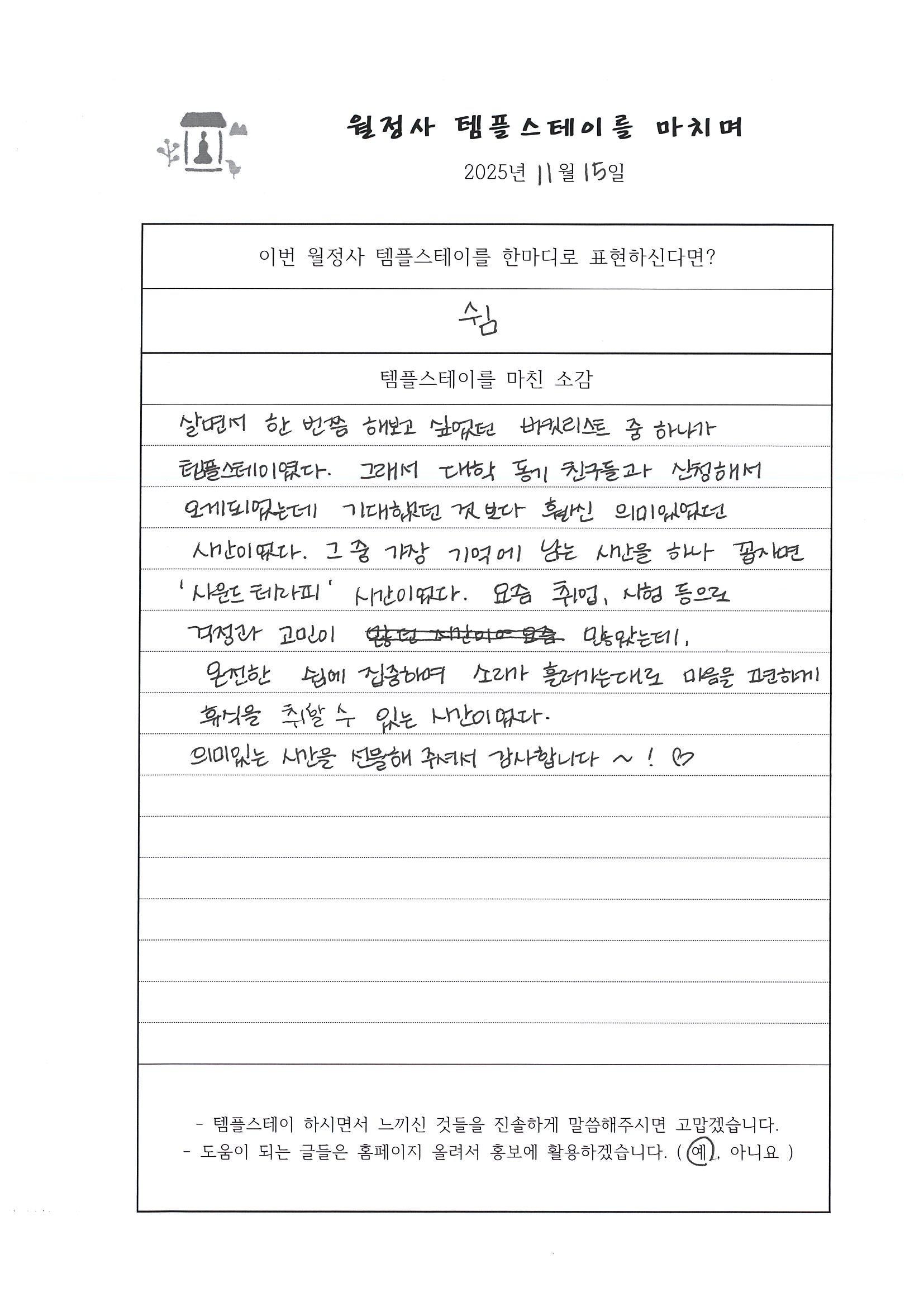 20251114~15 국립강릉원주대학교(원주캠퍼스)"선명상" 템플스테이 체험형 페이지 정보 작성자 템플 작성일25-11-15 15:21 조회178회 댓글0건 본문 #월정사#108배 및 염주만들기#예불#싱잉볼#타종#걷기명상#스님과의차담 댓글목록 등록된 댓글이 없습니다. 이전글 다음글 목록
